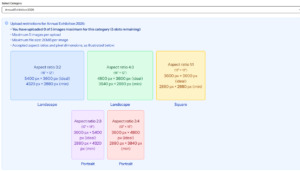 You will then see a reminder of the restrictions on aspect ratios, pixel dimensions and file sizes, as described in detail (and above) in the exhibition team’s instructions: